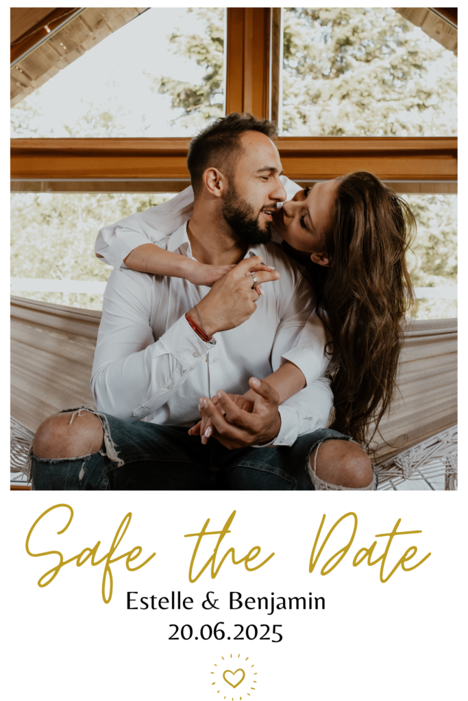 Diese Karte ist für Paare, die einen Hauch von Luxus und Eleganz lieben. Mit einer feinen, goldfarbenen Schrift und einem edlen Layout wird euer Foto kunstvoll in Szene gesetzt. Jeder, der diese Karte erhält, wird die Exklusivität und besondere Bedeutung dieses Moments spüren.