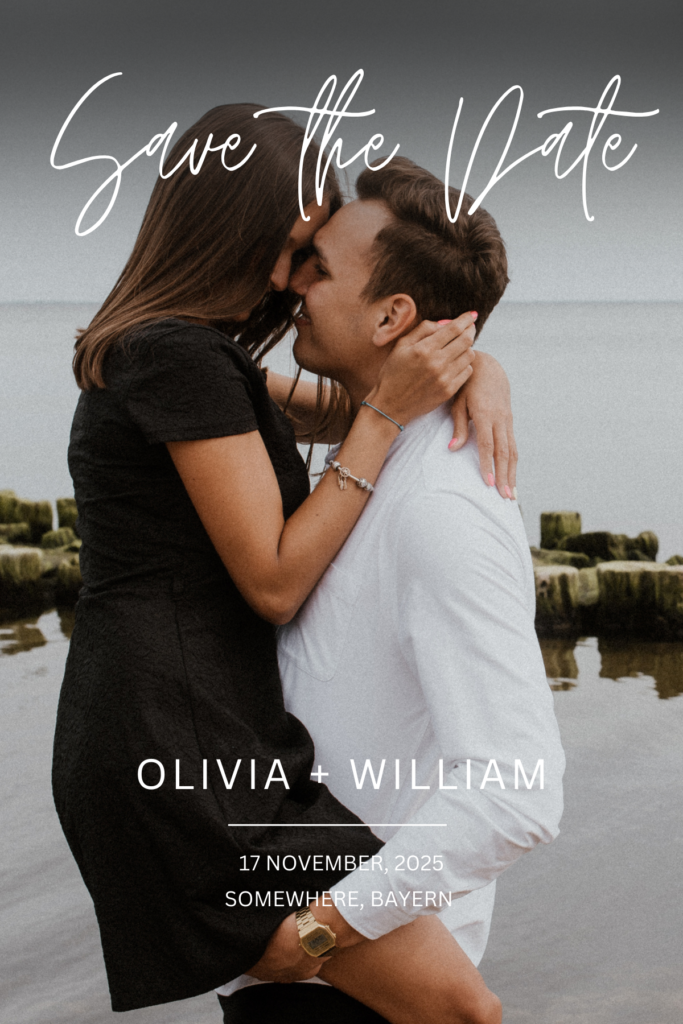 Der Stil dieser Karte spricht für zeitlose Raffinesse. Eine klassische Serifenschrift, kombiniert mit einem formalen Layout, betont die Bedeutung eures besonderen Tages. Das Bild ist zart eingebettet und lässt eure Liebe im Mittelpunkt erstrahlen – perfekt für Paare, die auf Tradition und Klasse setzen.